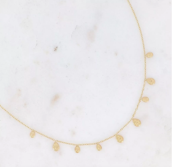 Collier sur chaîne en acier inoxydable composé de pampilles en forme de goutte texturée.