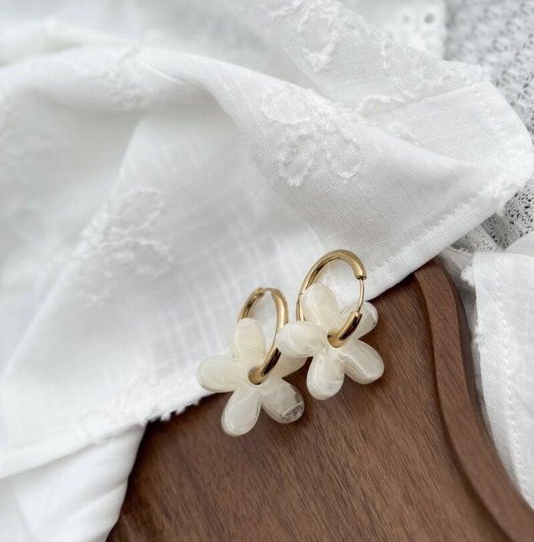 Boucles d'oreilles type créoles avec fermoir à charnière en acier inoxydable composées d'un anneau simple ainsi que d'une pièce en forme de fleur en acétate coloré.
