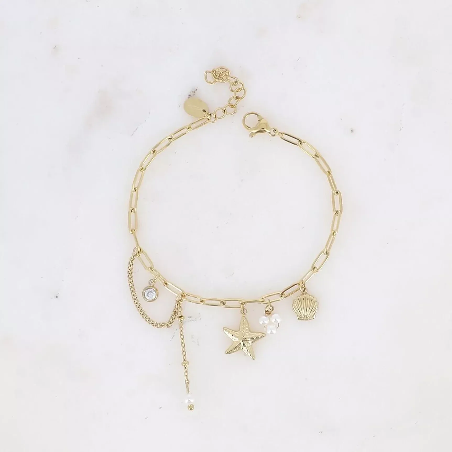 Bracelet sur chaîne en acier inoxydable composé de pierres naturelles rondes, un coquillage texturé, un cristal taillé rond et d'un pendentif en forme d'étoile de mer.