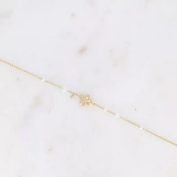 Bracelet sur chaîne en acier inoxydable composé d'une petite fleur texturée et de petites perles de résine blanche.