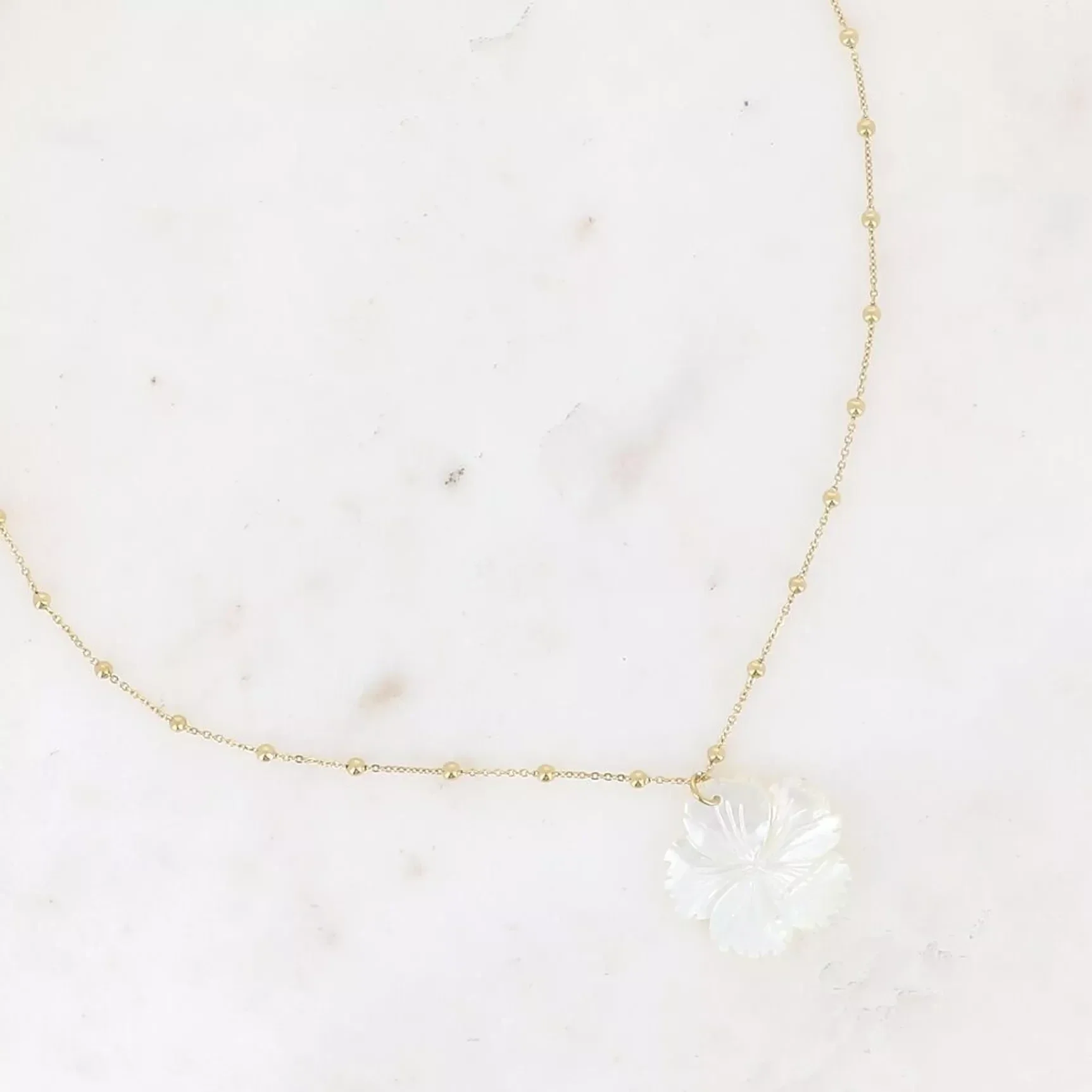 Collier sur chaîne en acier inoxydable composé d'une chaîne à boules et d'un pendentif sous forme de fleur nacrée.