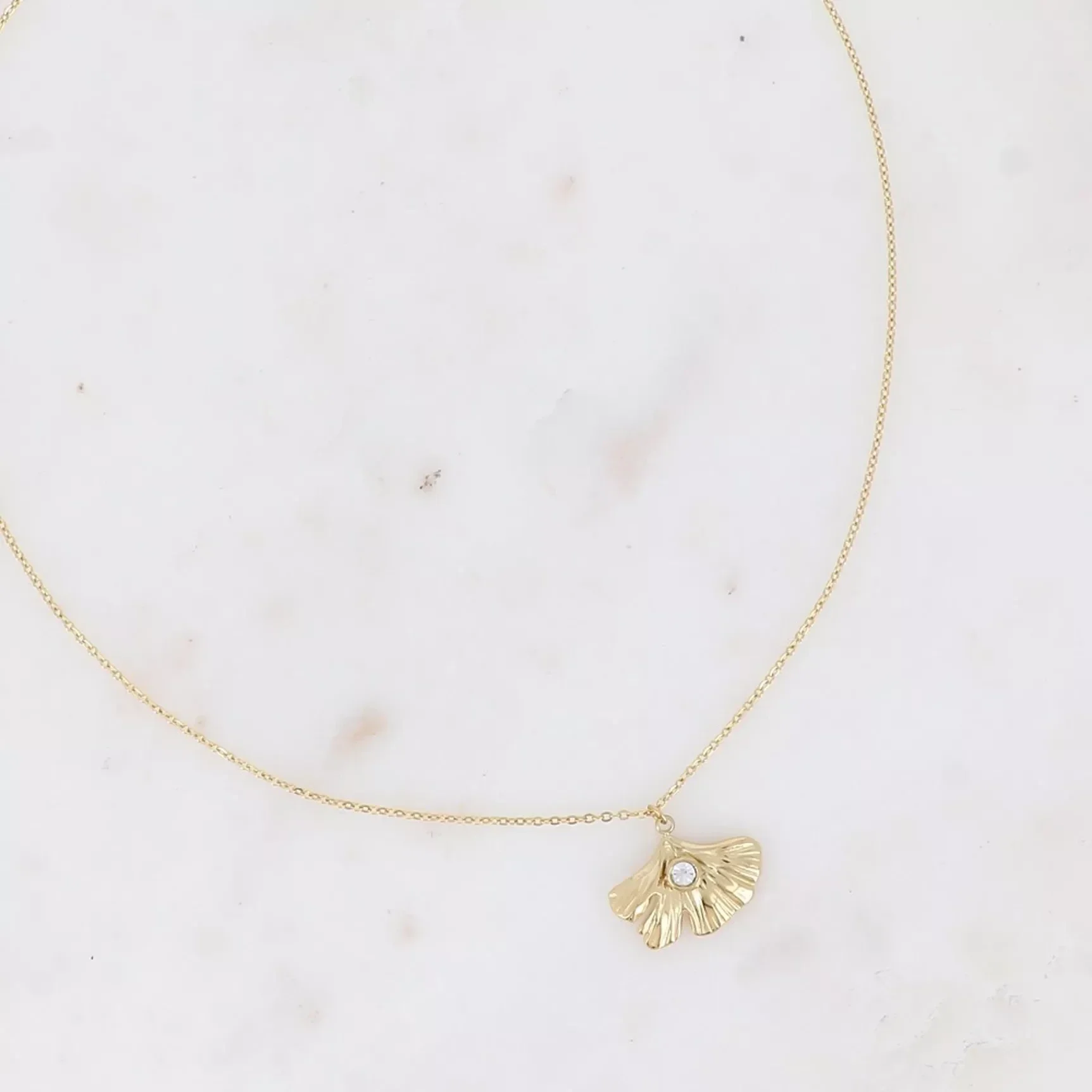 Collier sur chaîne en acier inoxydable composé d'un pendentif en forme de ginko orné d'un cristal.Longueur de la chaîne: 39 cmLongueur de la chaîne de réglette: 7 cmLongueur totale du collier : 46 cmDimensions du pendentif : 20 x 15 mm