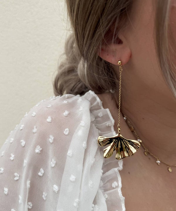 Boucles d'oreilles à puce en acier inoxydable composées d'une boule et d'une chaîne sur laquelle est accroché un grand ginko.Dimensions de la boucle : 39 x 89 mm